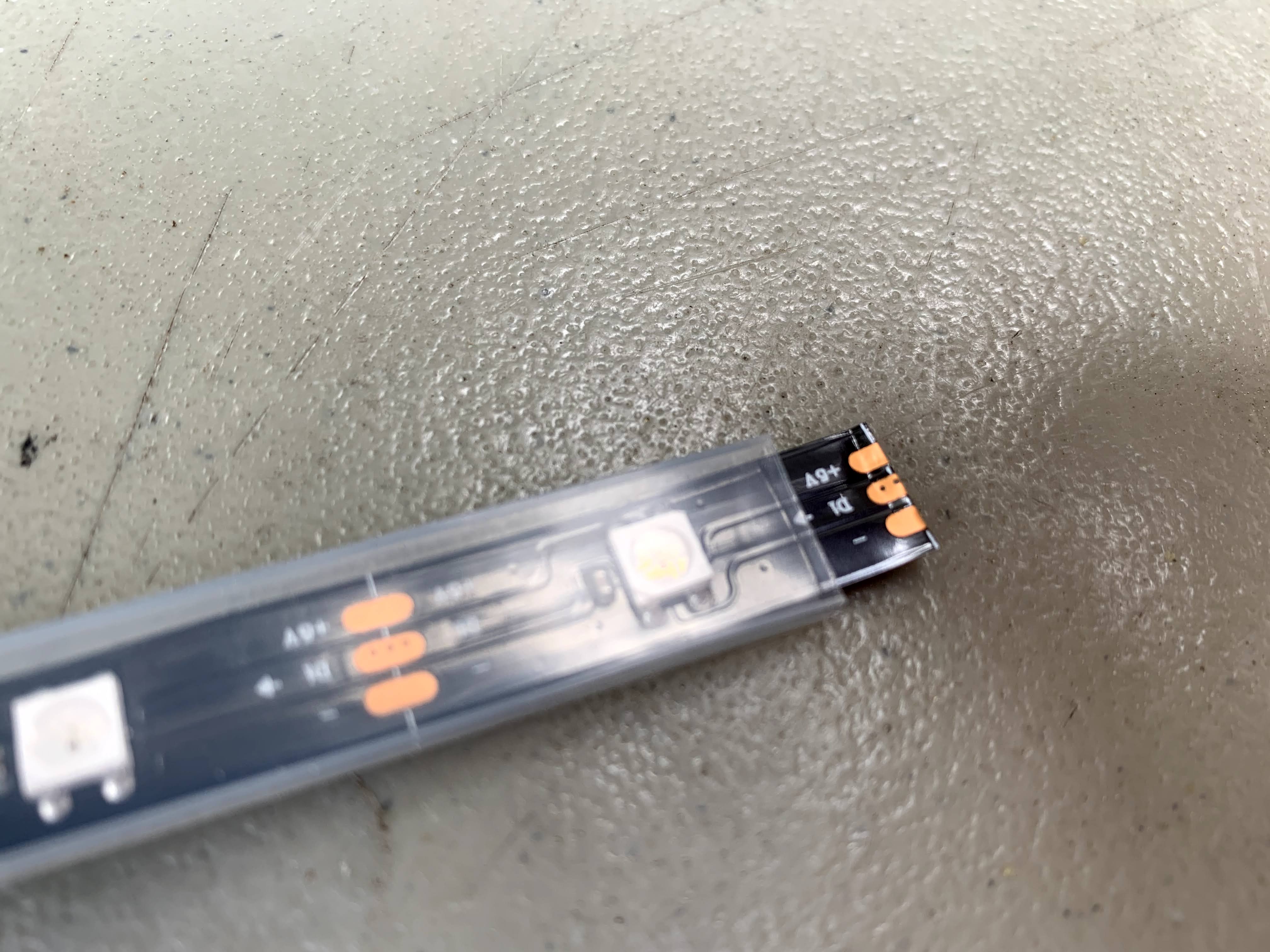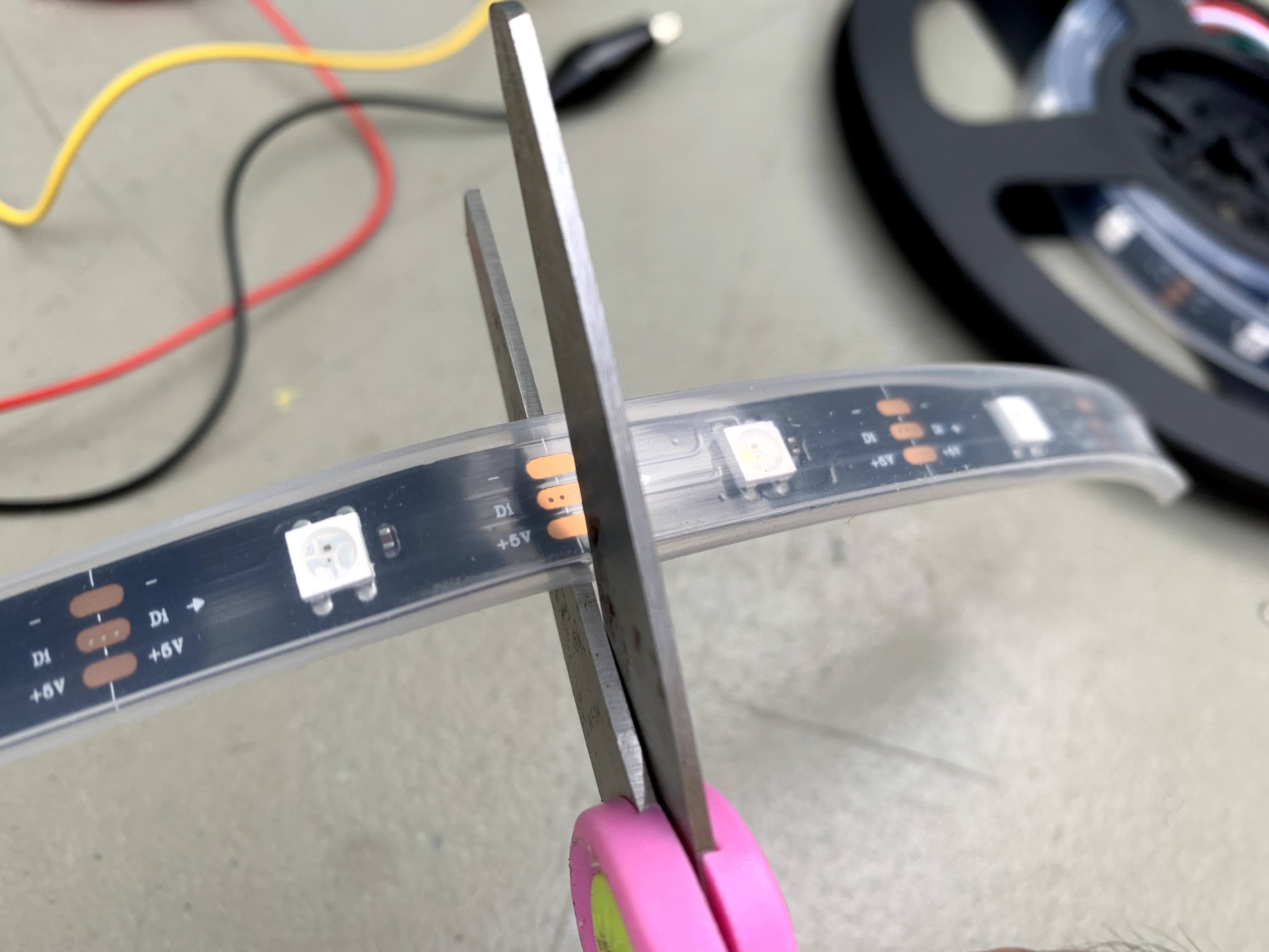 The key when cutting LEDs is to look for the cut line, where three copper pads run cross-length on the strip.