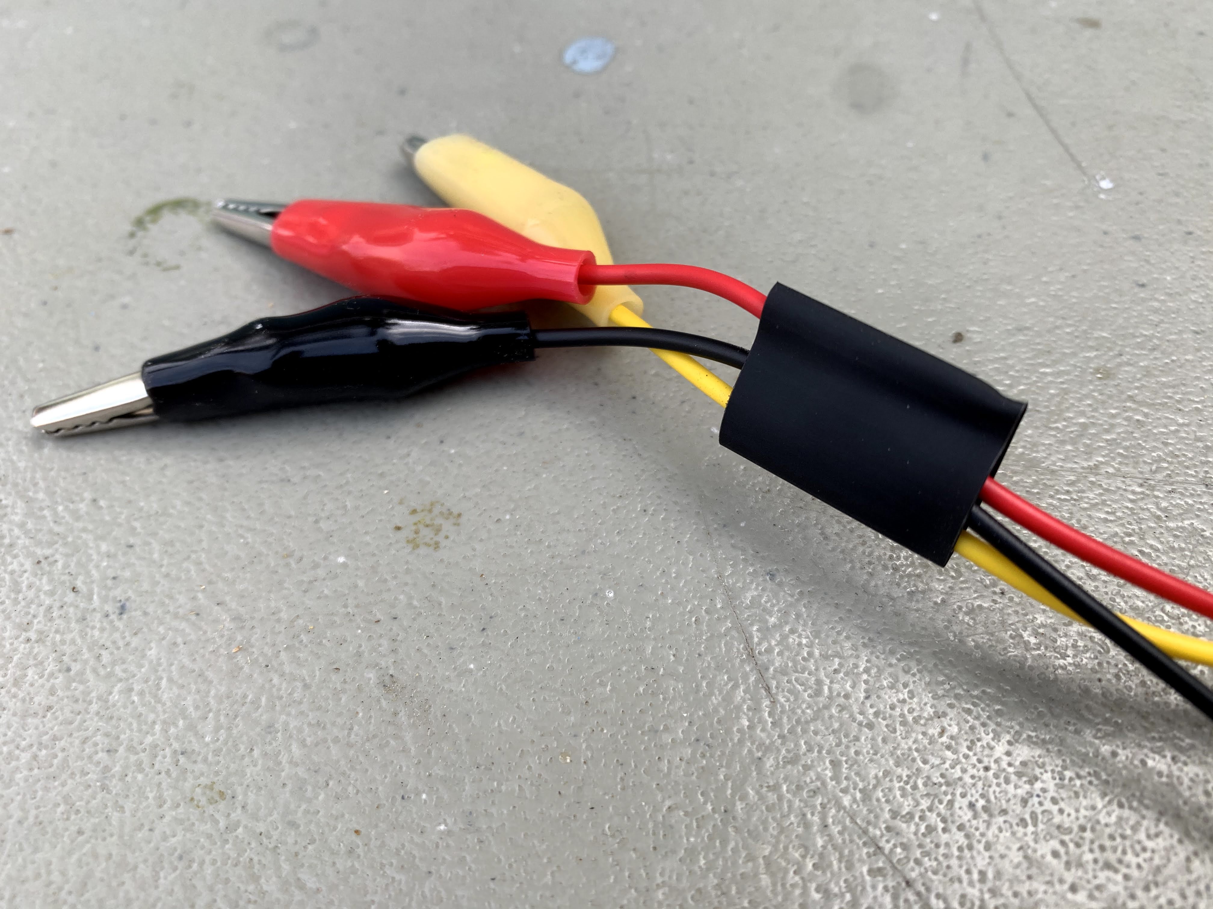 I take a small strip of wide heat shrink and place it over the three alligator clips before soldering. This pre-placement allows me to slide it up the path to shrink around the connecting area and protect the solder points.