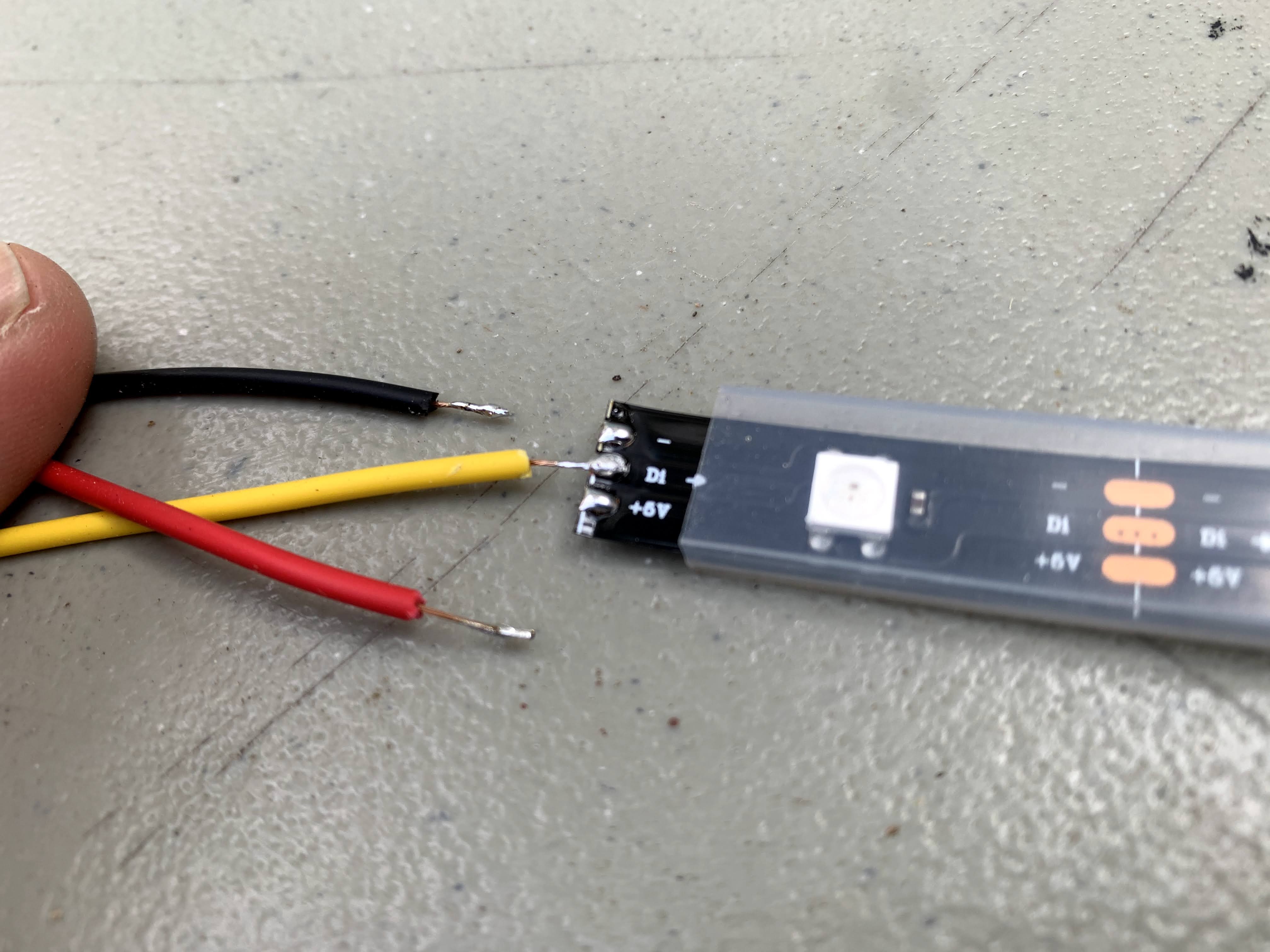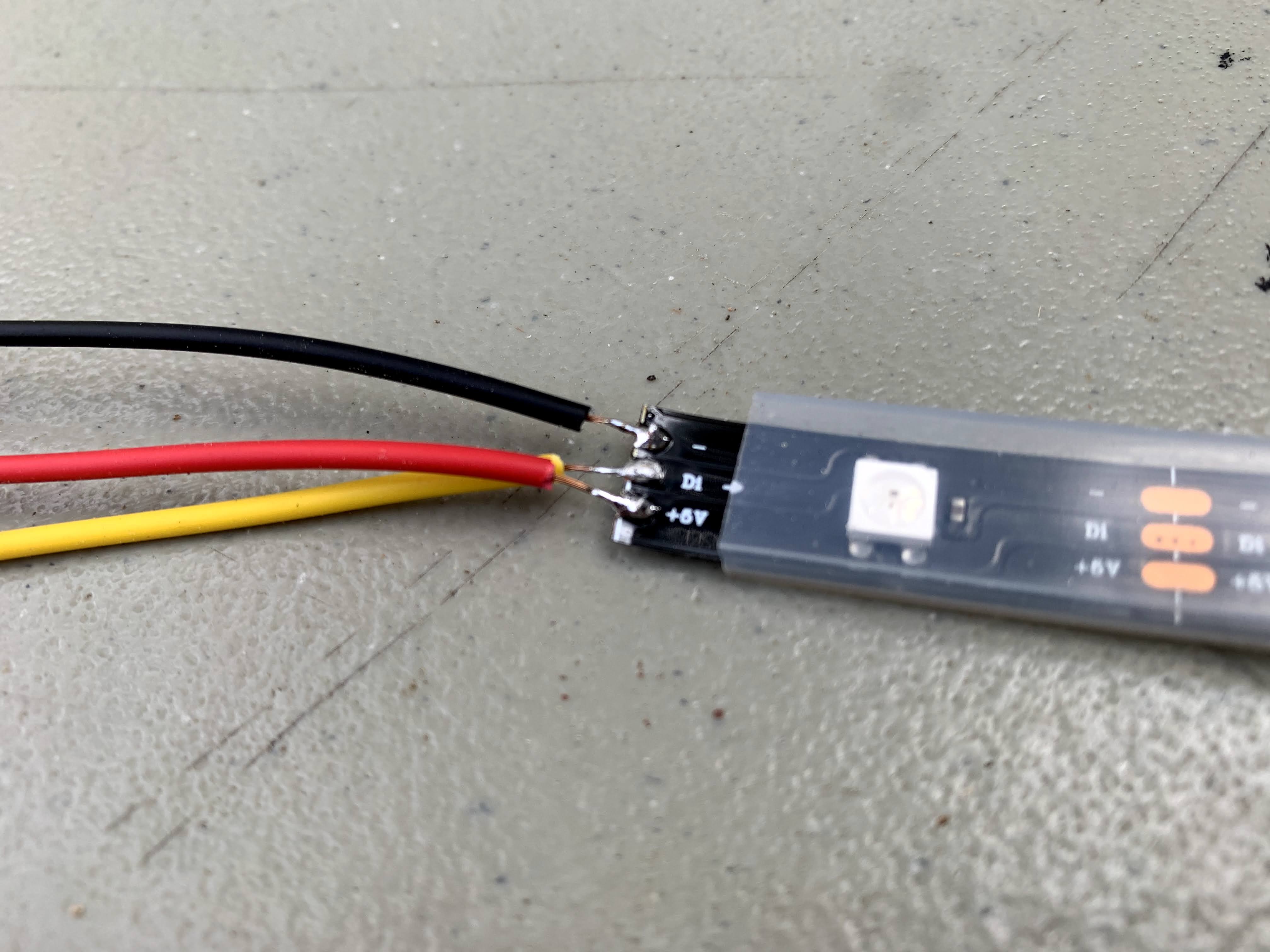 Please note the directional arrow that is printed on the strip near the copper pads, it shows the direction from power to the LEDs. Solder your leads with the arrow pointing away from them, leading to the LEDs.