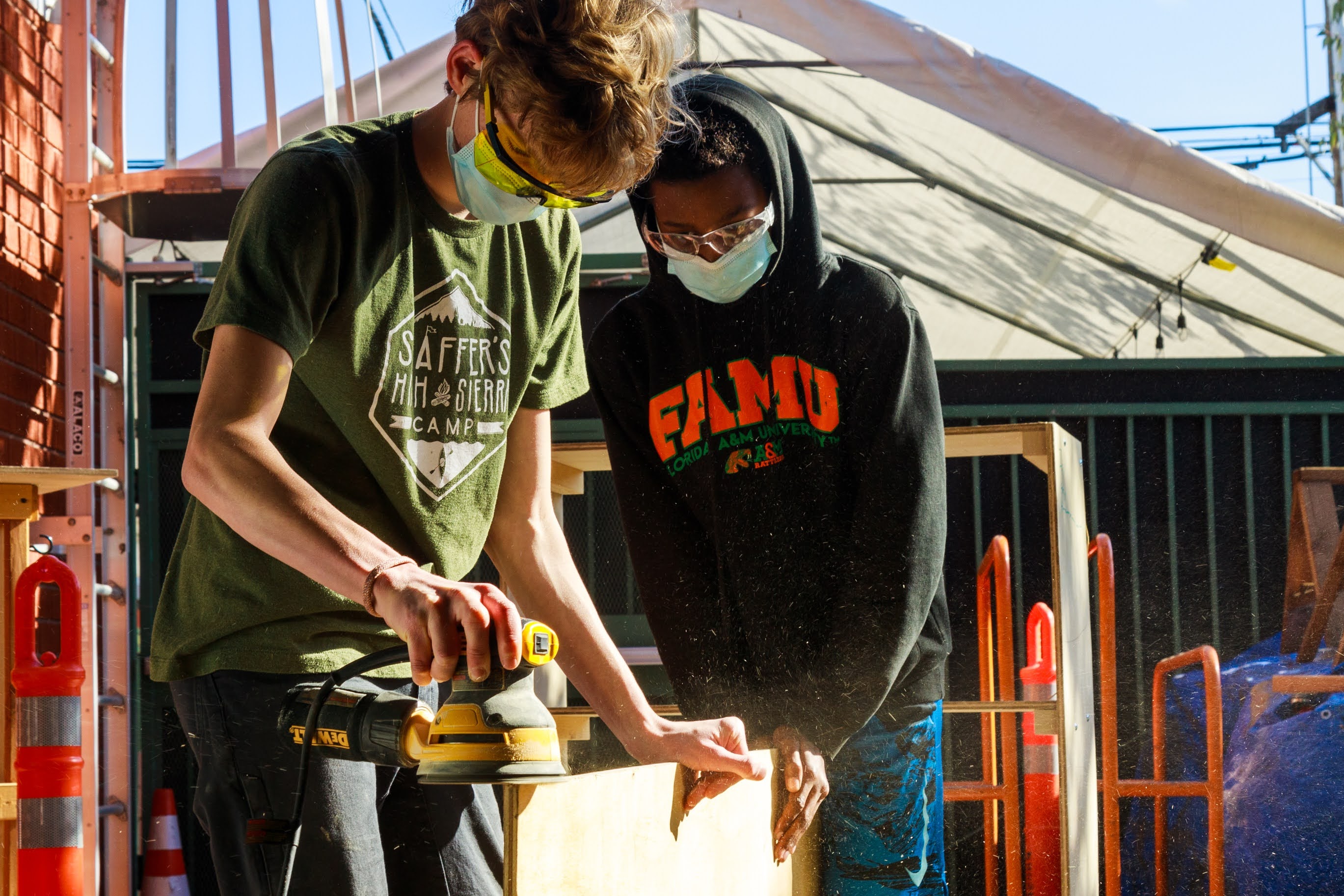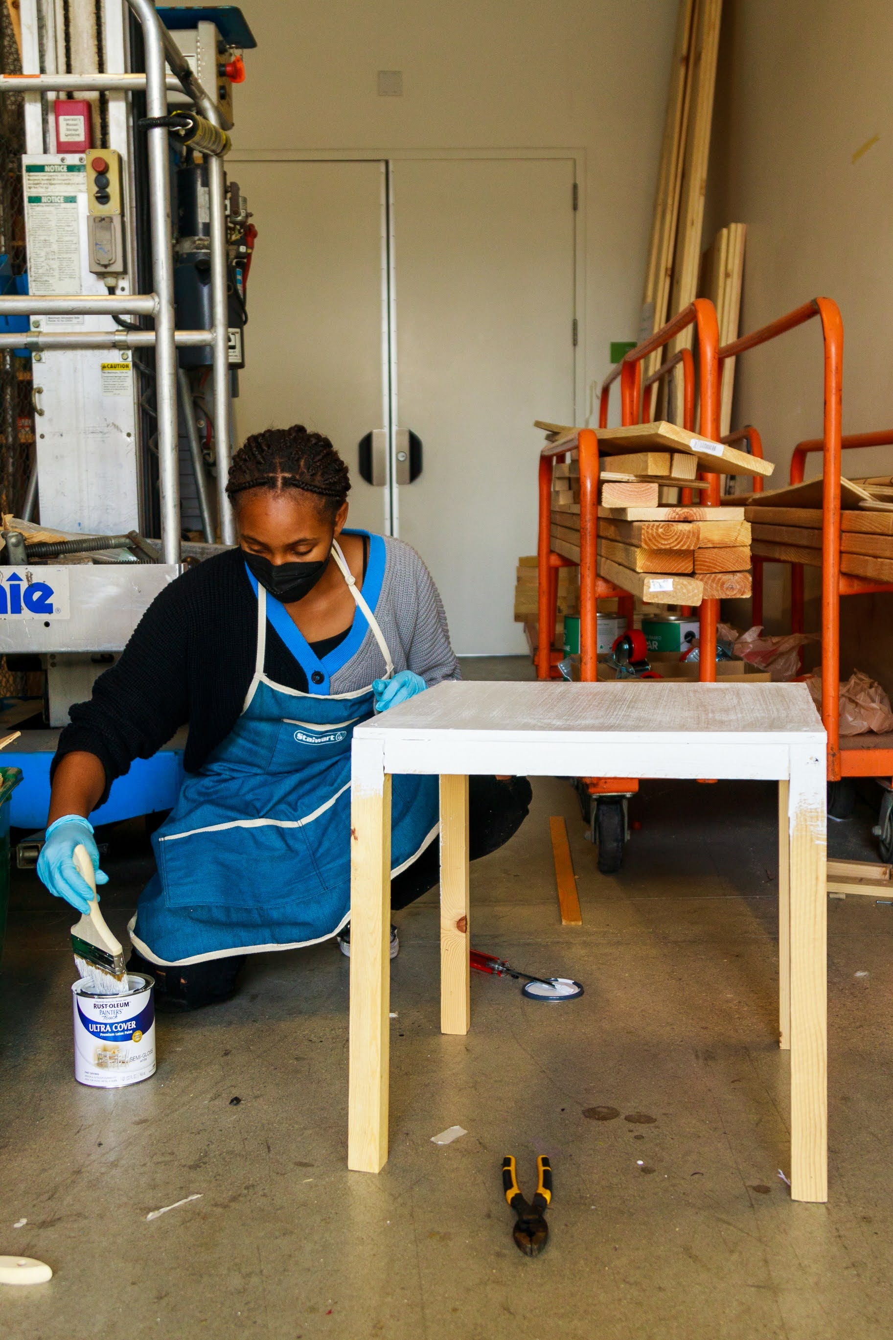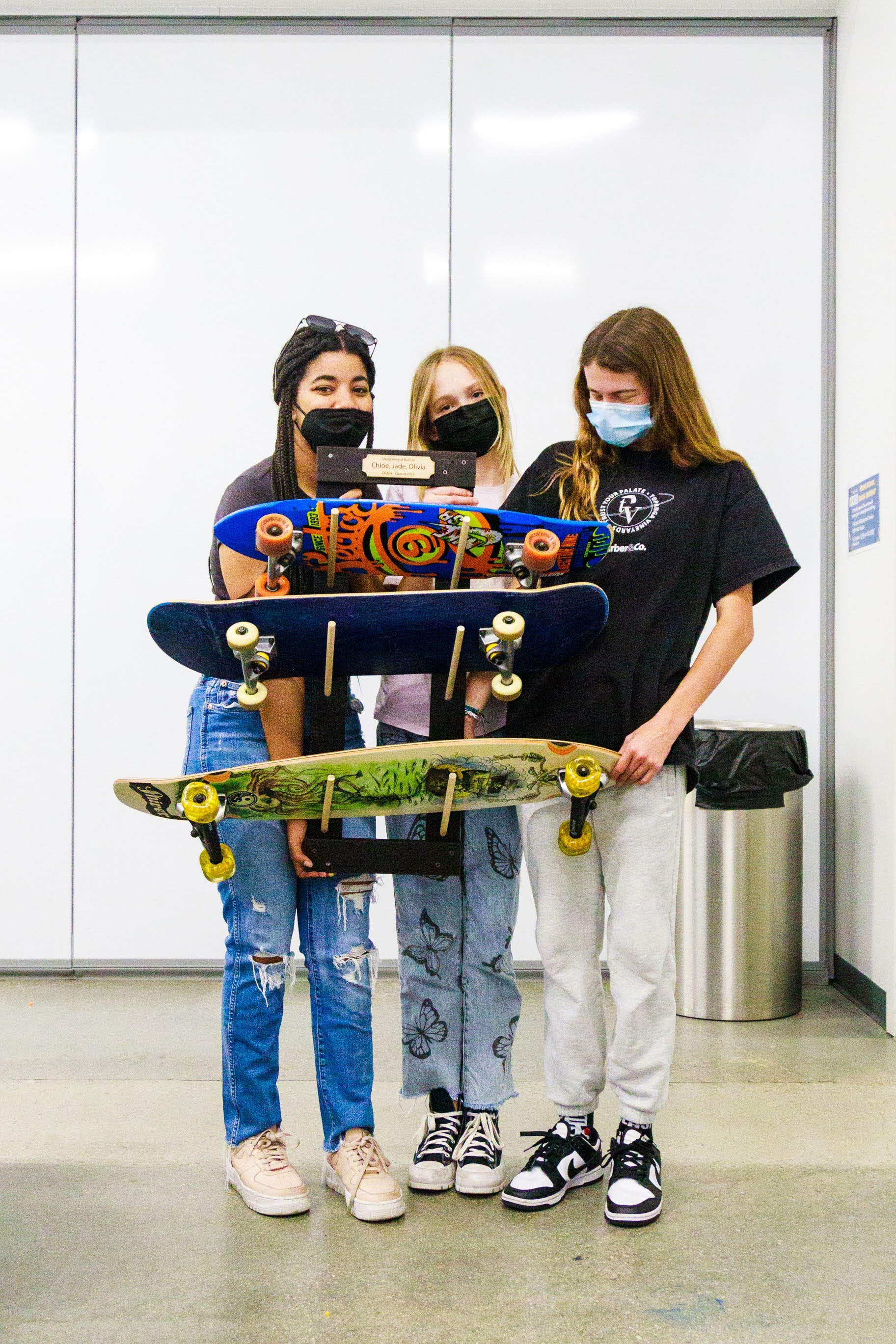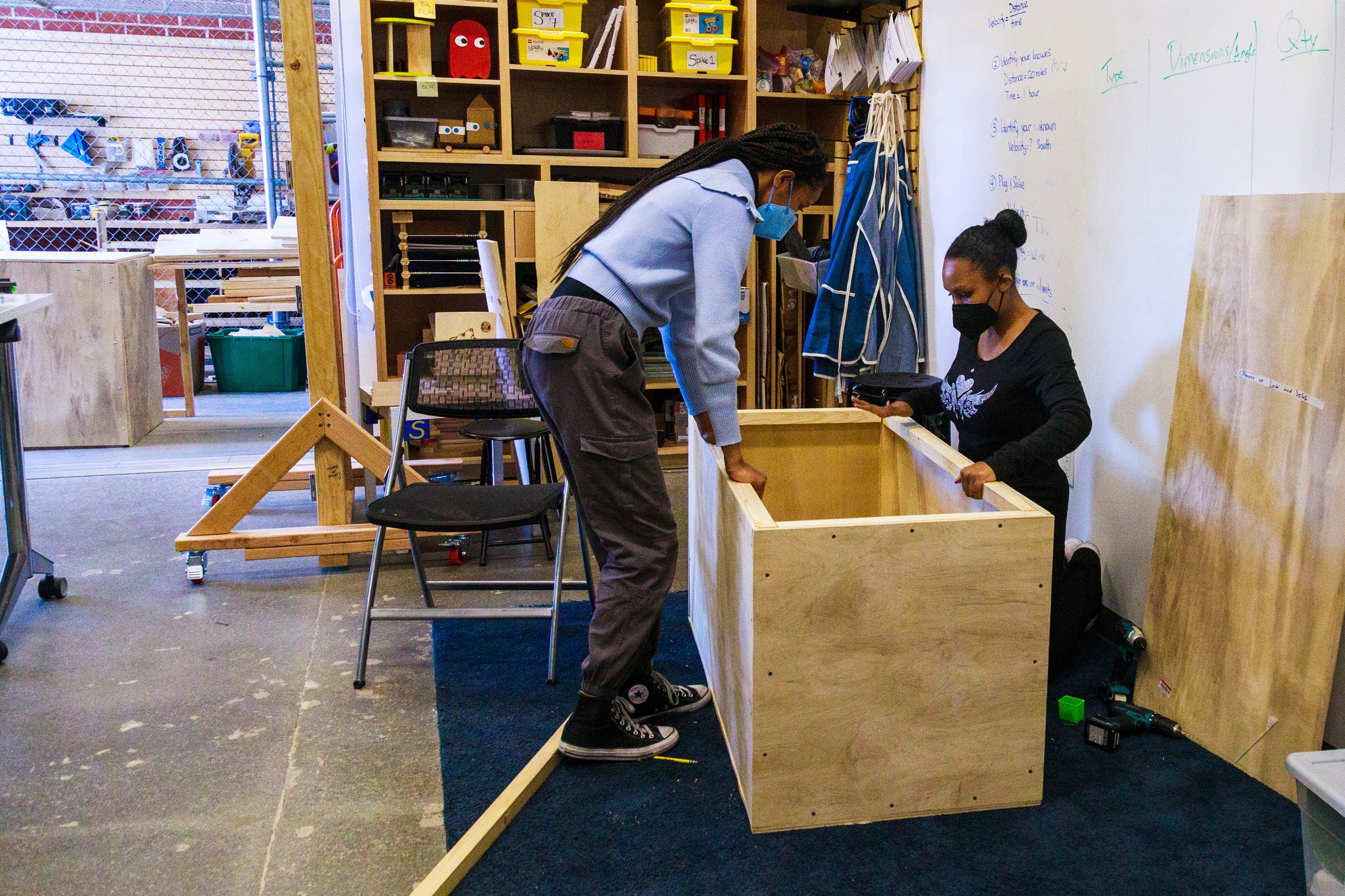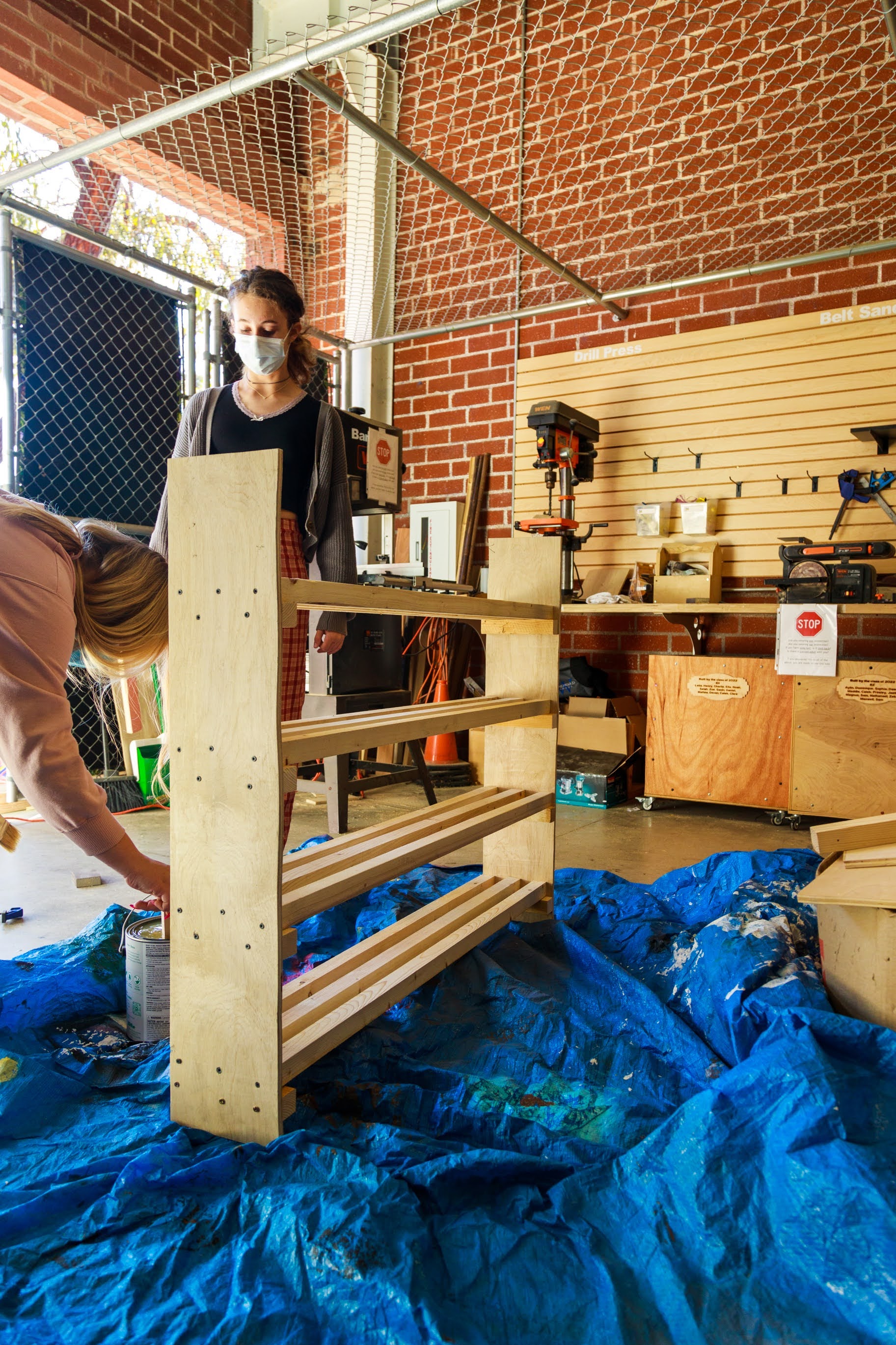 Projects ranged from bookshelves and step stools to shoe racks and rolling storage bins. The theater department requested portable swinging doors for use on stage, while a skateboard-riding administrator asked for a wall-mounted rack for her boards.