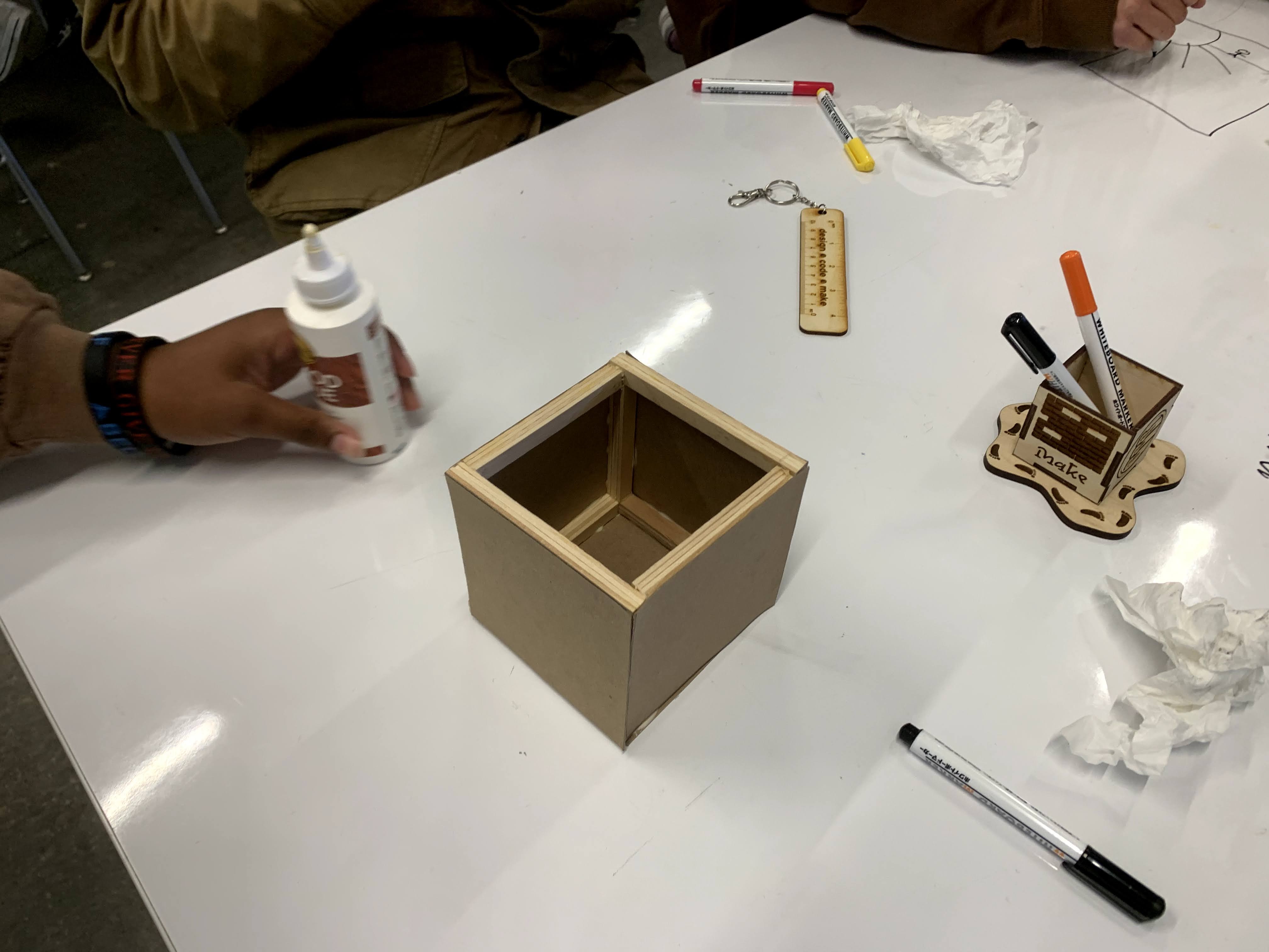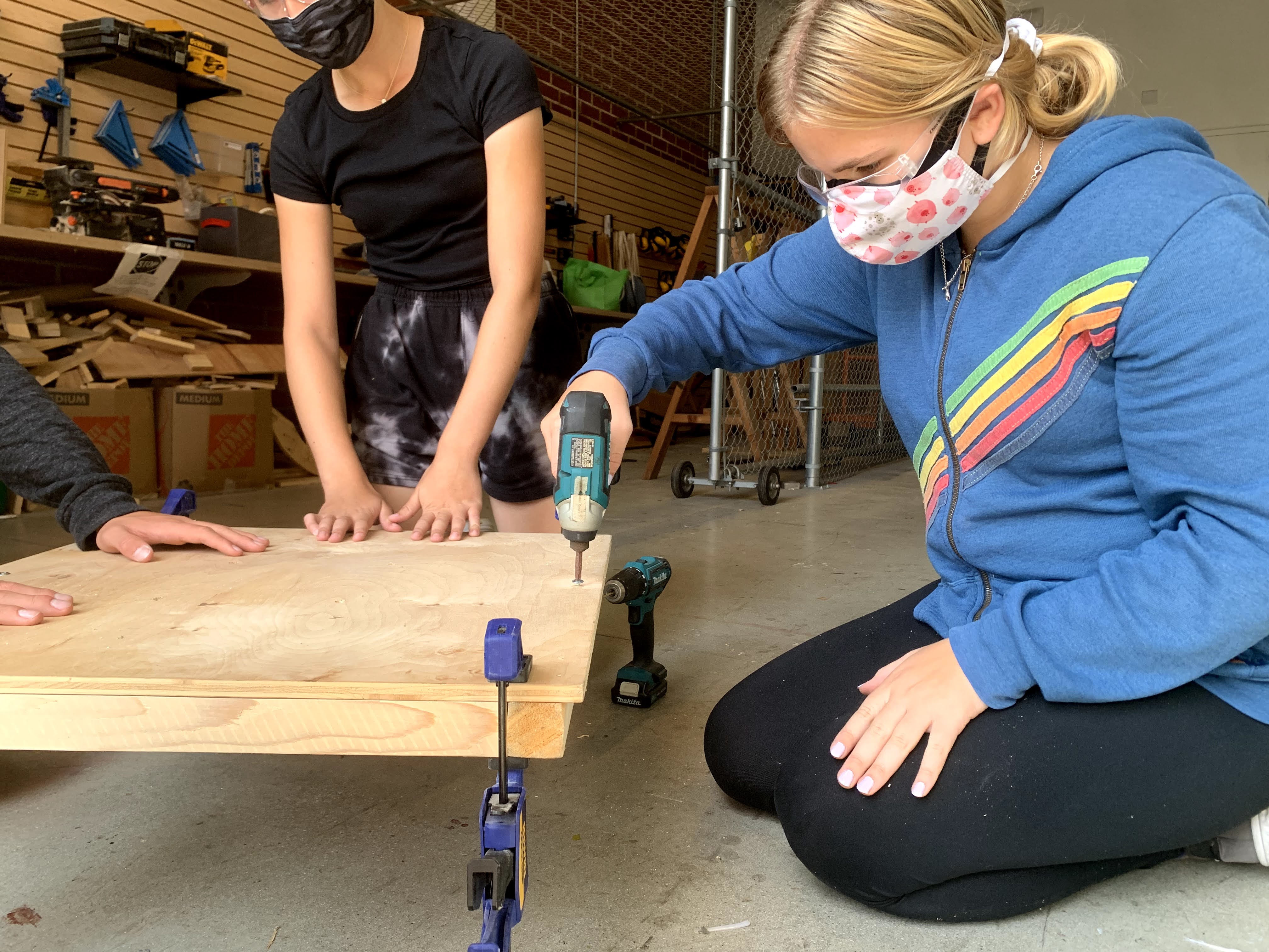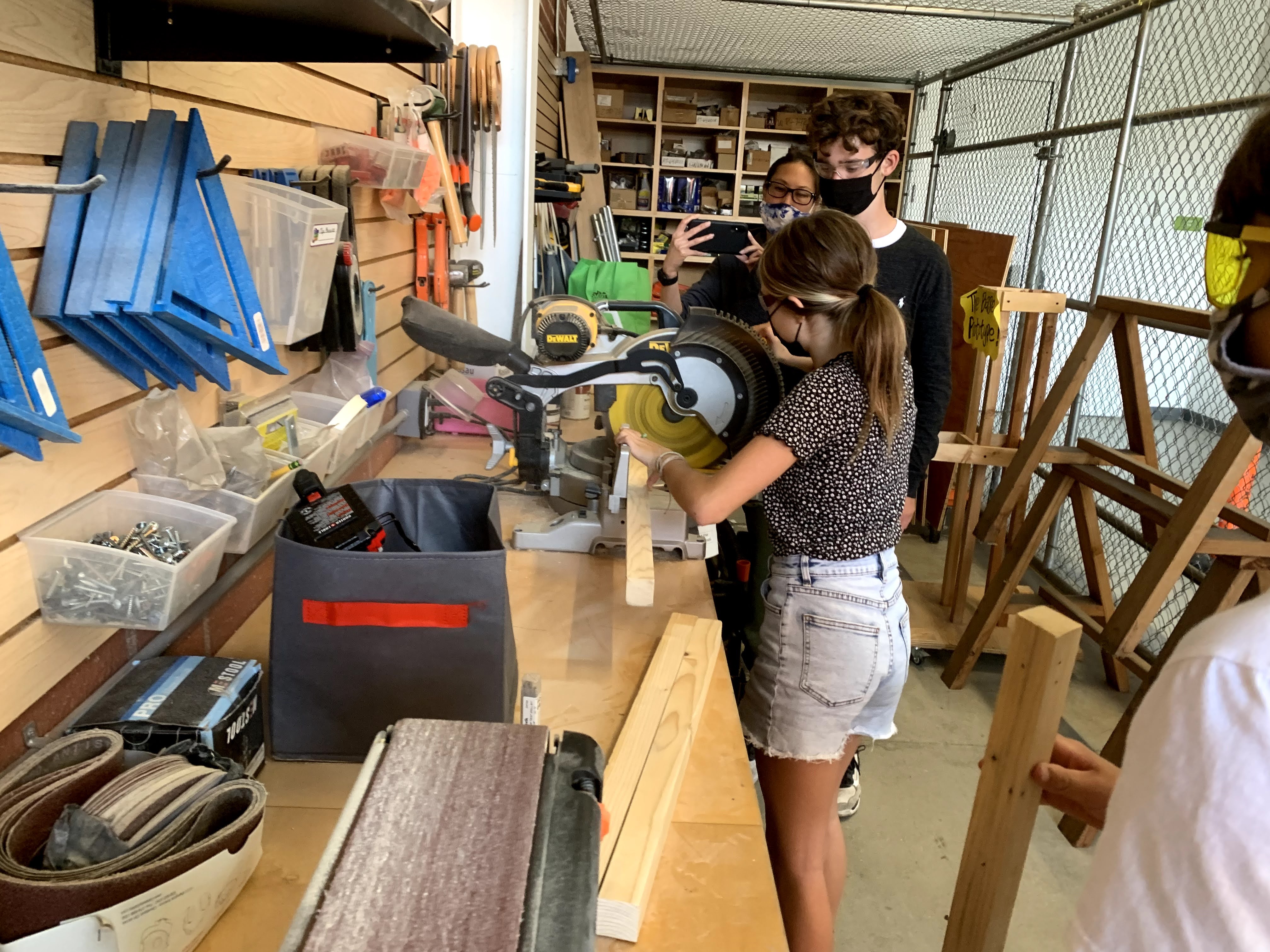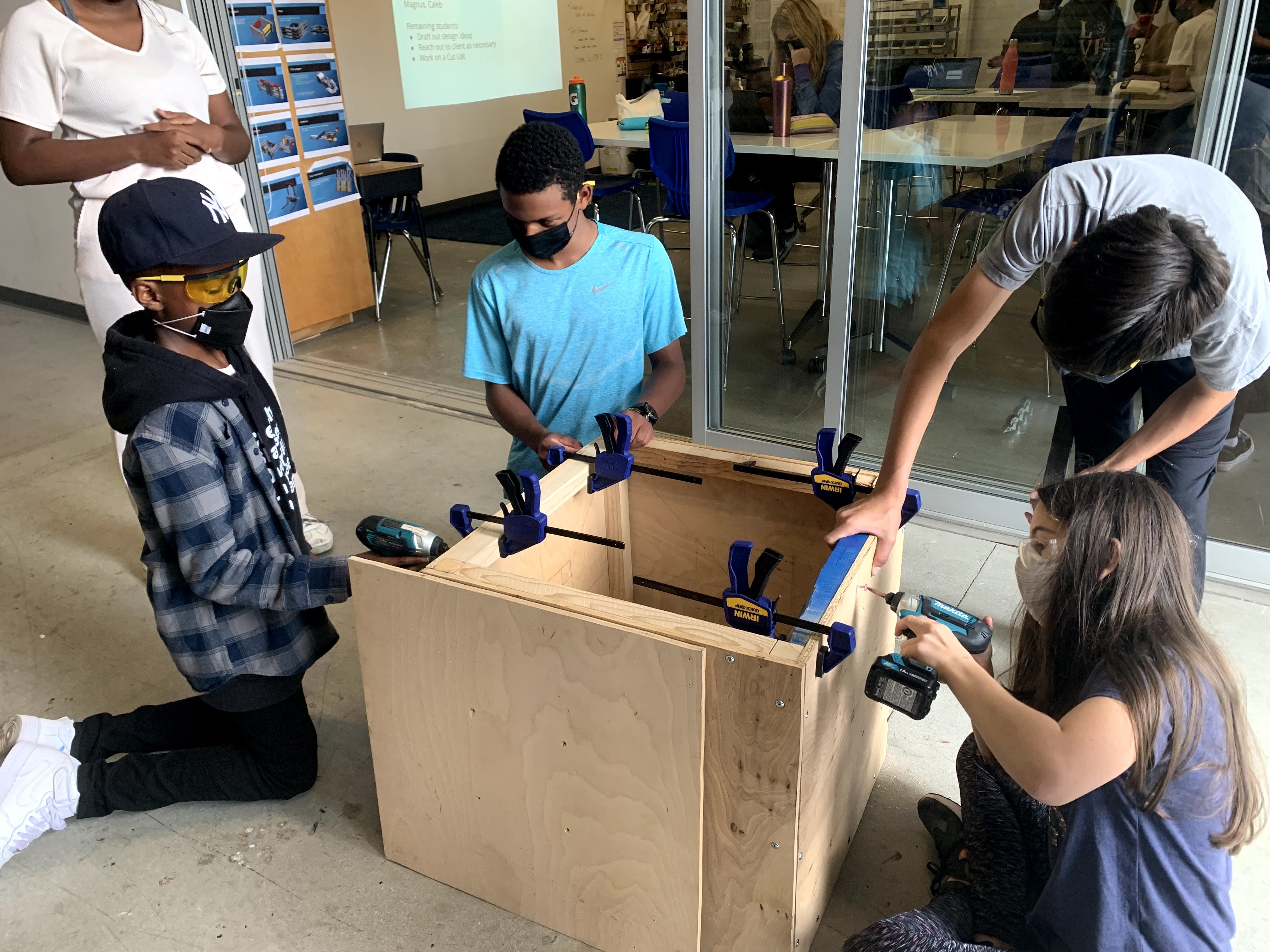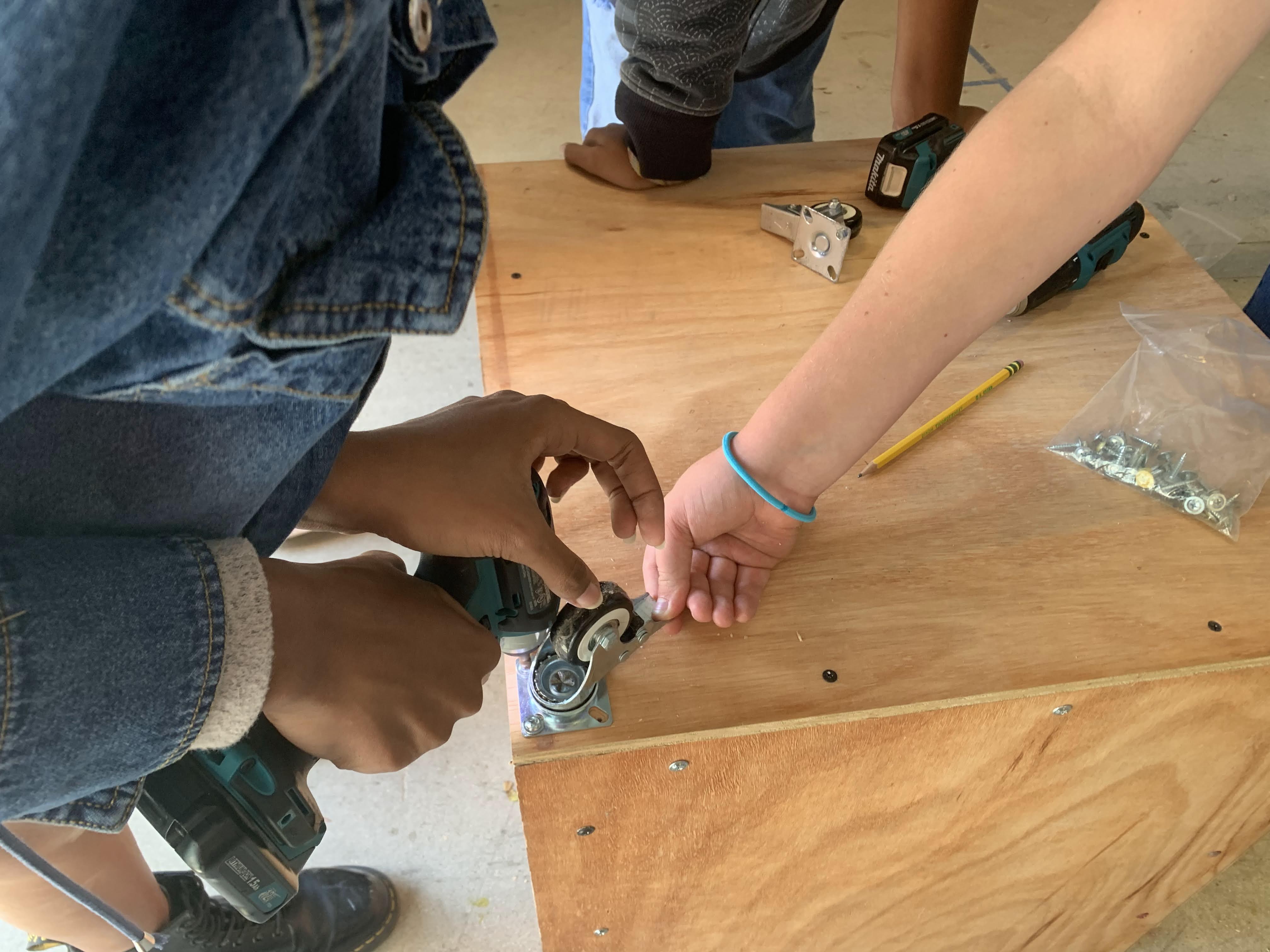 We moved from the prototype to constructing a real-world storage bin for our Maker Court, training our students in the safe and proper use of each of the power tools. They also discovered various types of wood, effective clamping techniques, and how to create a cut list.